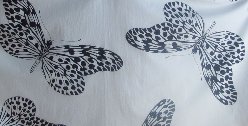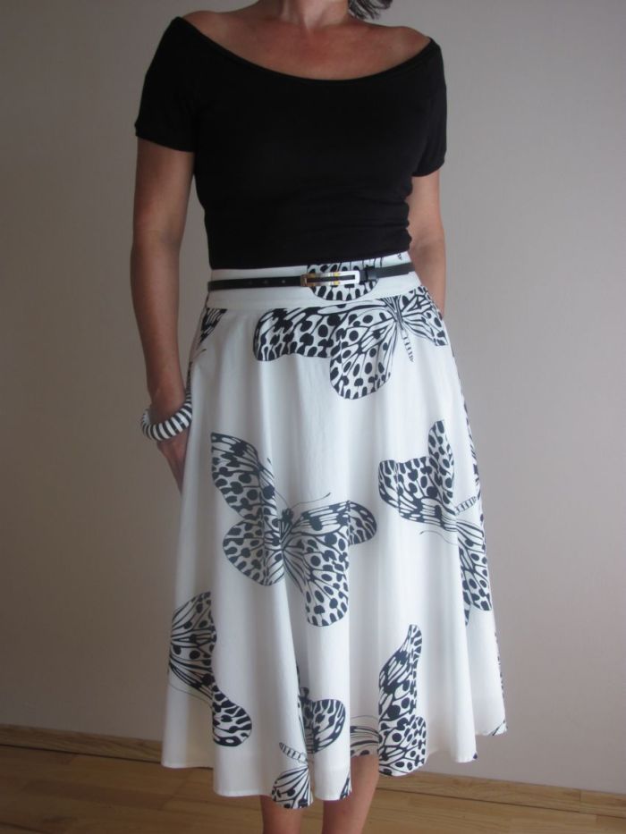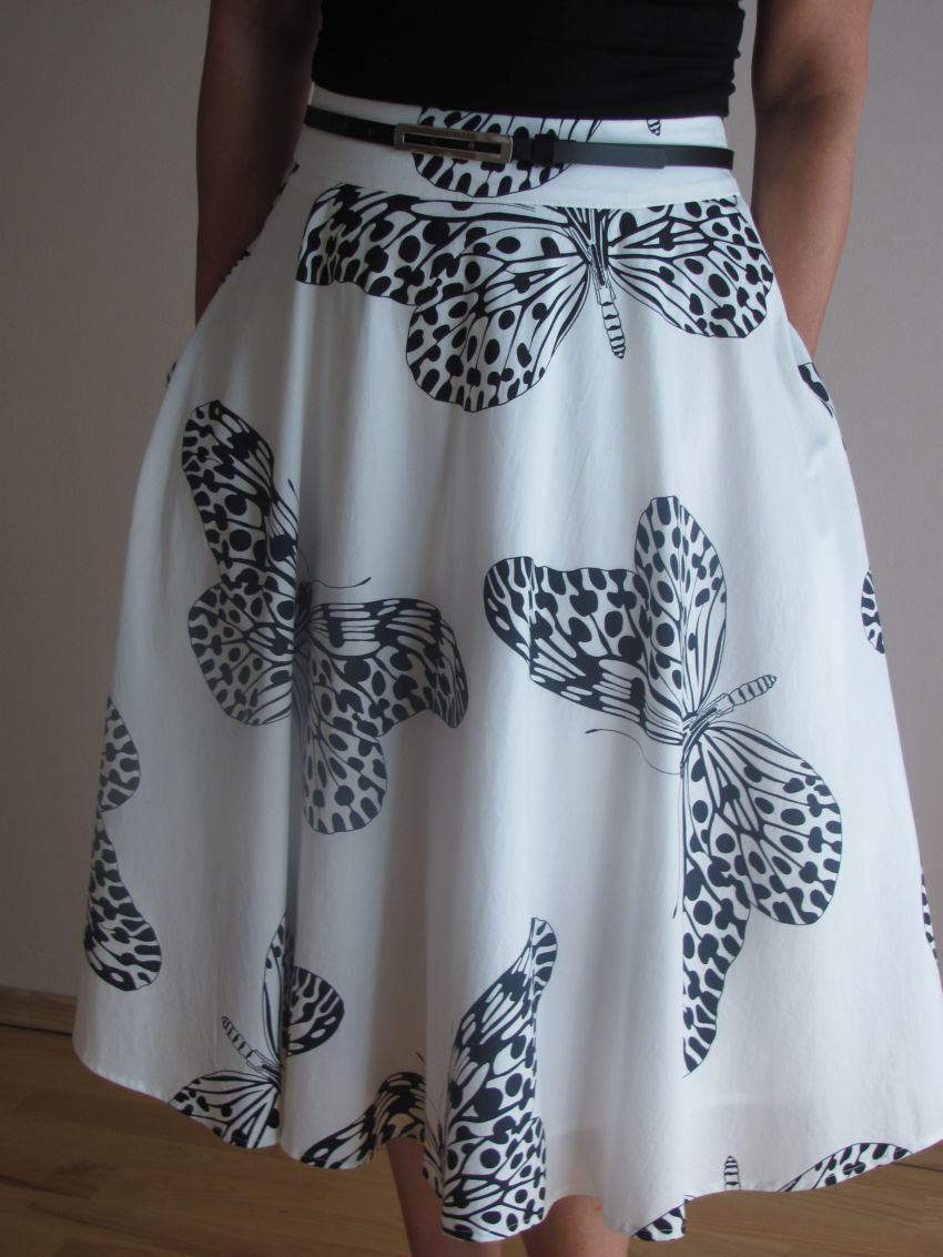 Sukně je ušitá z bílého bavlněného strečového popelínu s potiskem motýlů (97 % bavlna, 3% elastan). Letos jsem viděla několik širokých letních sukní v bílo-černé kombinaci. Mám tuto barevnou kombinaci ráda a tak volba padla na látku z mých zásob. Původně jsem ji chtěla použít na pouzdrové šaty. Je ale hodně průhledná, takže bych musela použít podšívku. To jsem nechtěla a tak zůstala nepoužitá ve skříni.