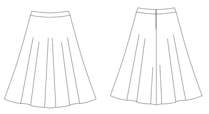 Střih na sukni je 3/4 kruhu, zadní díl se středovým švem a skrytým zipem. Pas je tvarovaný, vyztužený z vnitřní strany pevným keprem. Na podšívku jsem použila jemný bavlněný batist s nízkou gramáží, střih je poněkud užší a asi o 5cm kratší než na sukni jak můžete vidět na obrázcích.